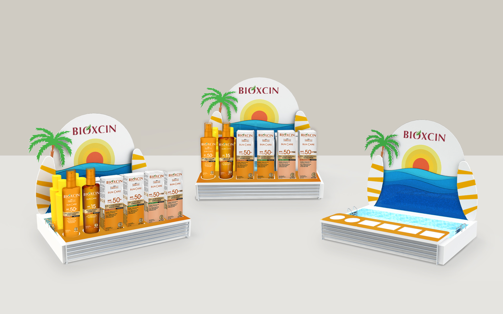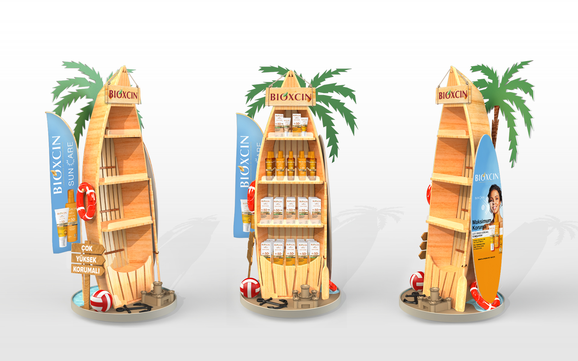 Konsept stand tasarımımız perakende mağazaları veya eczaneler için idealdir çünkü müşterilerin Bioxcin güneş bakım ürünlerine kolay erişmesini sağlar ve yüksek stoklama kapasitesine sahiptir. Bu proje, Bioxcin ürünlerini öne çıkarmayı ve satışları artırmayı amaçlamaktadır.