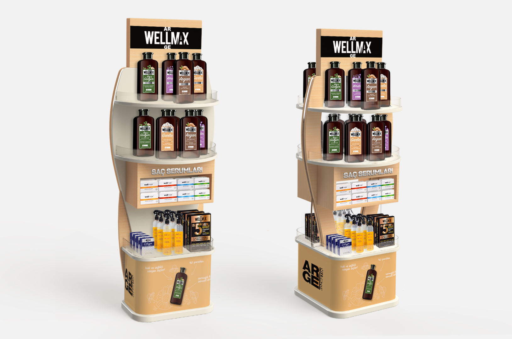 Kozmetik ve Kuaförlük Malzemeleri üreticisi Arge’nin Wellmax ve Maxwell ürünleri için, şampuan, saç bakım yağı, serum ve takviyeler gibi çeşitli güzellik ürünlerini barındıracak şekilde standlar tasarladık.